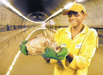 Numa Foto de Almeida Rocha para A Folha de São Paulo de 23/01/2010, o peixe que apareceu no túnel alagado, recolhido pelo gari responsável pela limpeza. O túnel liga bairros nobres da cidade de São Paulo e o lago mais próximo - do Parque Ibirapuera - fica distante alguns quilômetros.
